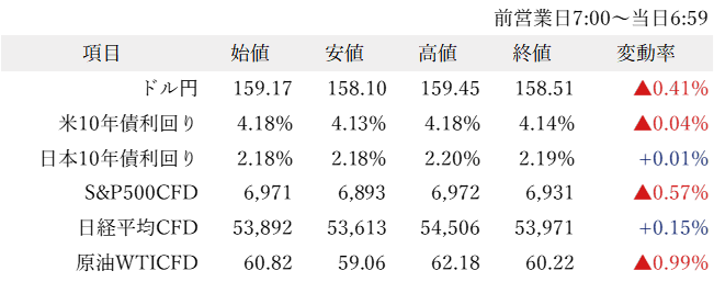 22:30に発表された米国11月小売売上高は前月比0.6%増加し、市場予想を上回った。これを受けて一時ドル円は反発するかに見えたが、ベッセント財務長官が、「韓国ウォンの最近の下げは行き過ぎだ」との考えを示したことから韓国ウォンが買い戻され、日本円も再度買いが優勢となり158.10円の安値を記録した。NY午後は米国株の買い戻しにつれ高となり158.51円まで値を戻して東京早朝を迎えている。