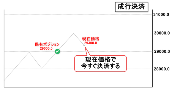 成行決済とは保有するポジションを現在価格で決済をする方法です。十分な利益が確保できた、これ以上の損失は耐えられない、大きなイベントが控えているなどリアルタイムで状況を判断して手動で決済を行います。金額よりも確実にポジションを整理することに重点を置いた決済方法です。