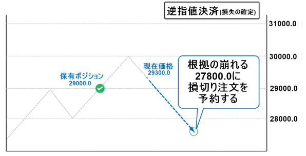 ストップロス注文や損切り注文とも呼ばれ、資金を守るための決済方法ですので必ず入れるようにしましょう。