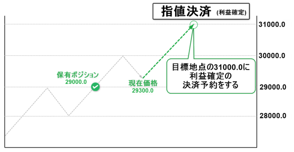 指値決済とは保有するポジションに対して、保有した価格よりも有利な価格に決済注文を入れる注文方法です。到達すると想定した位置までレートが届いた際に決済を行い利益を確実に確保します。その反面それ以上価格が伸びてしまったときも利益は指定した価格までとなってしまうことには注意が必要です。指値決済も指定した価格にレートが到達した時点で自動で決済が行われるため、もう少し伸びるかもしれないなどの感情に左右されることはありません。