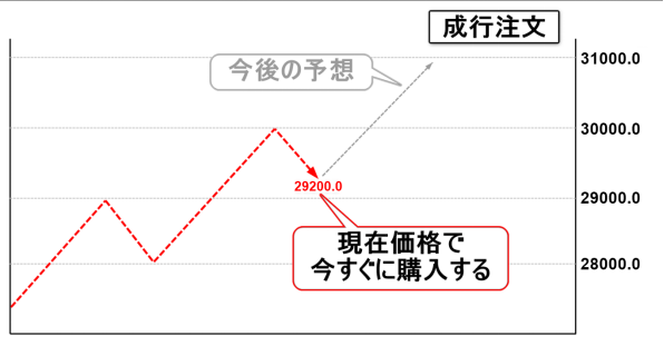 成行注文とは買いたい売りたいと思ったときにその時点の現在価格で注文を出します。チャート画面で分析を行いチャンスだと思ったタイミングで注文を行うリアルタイム取引で使われます。注文はすぐに約定されるため、価格よりもポジションを保有することに重点を置いた取引方法です。