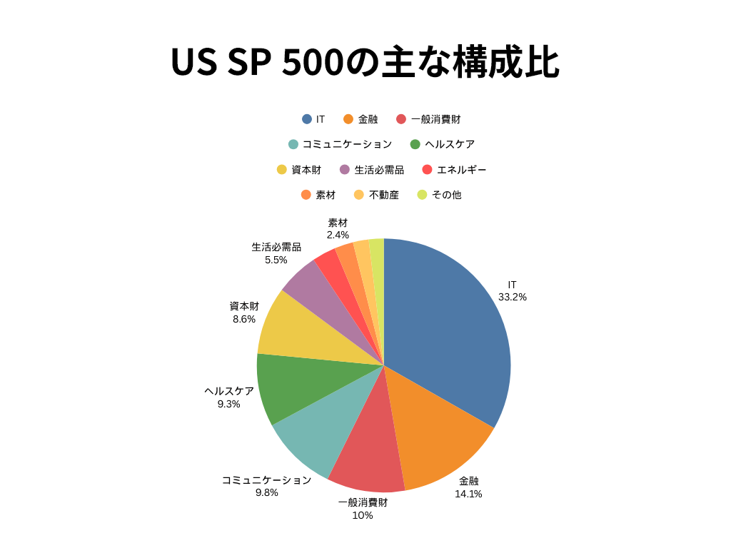これら上位10社がUS SP 500指数全体の約38%を占め、上位50社で60%を構成しています。このことから、 米株500 (US SP 500)への投資は実質的に米国の超大型企業への投資であることが分かります。