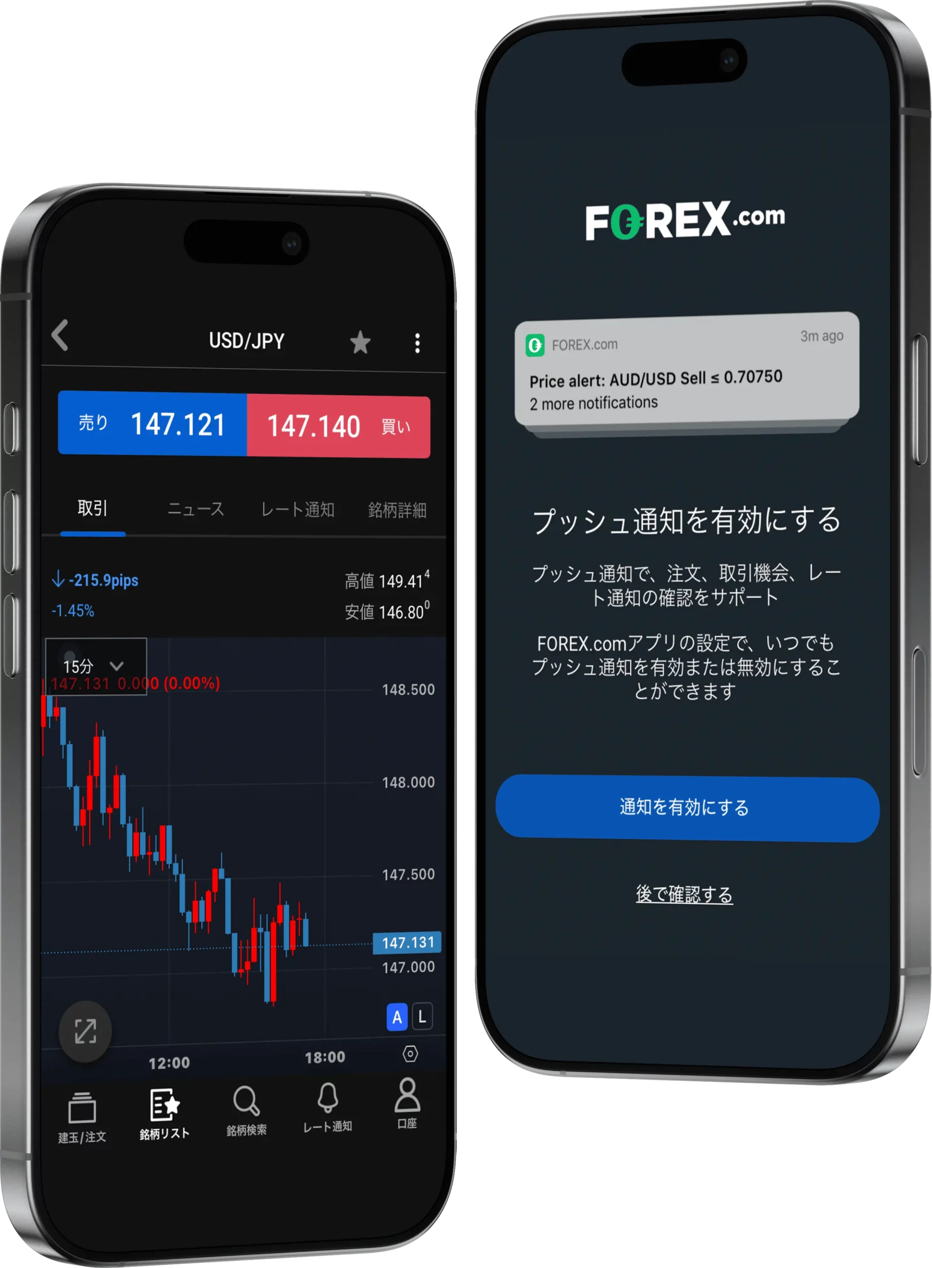 レートがあるレベルに達したかどうか、画面を常に見ている必要はありません。レート通知を設定するだけで、プッシュ通知、またはメールで通知を受けることができます。当社の通知機能には以下のようなものがございます。