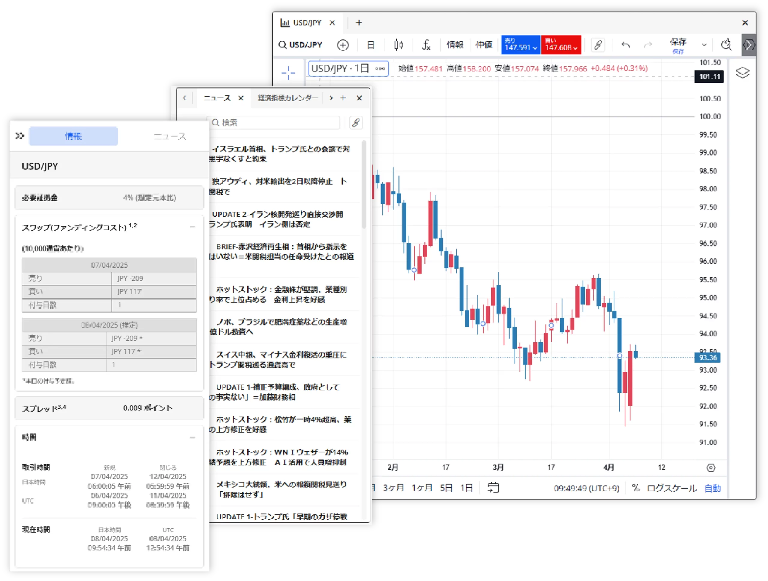 銘柄名の横にある下向き矢印をクリックするだけで、その銘柄の豊富な情報を見ることができます。チャート、ニュース、必要証拠金、取引時間など、あらゆる情報をご確認ください。